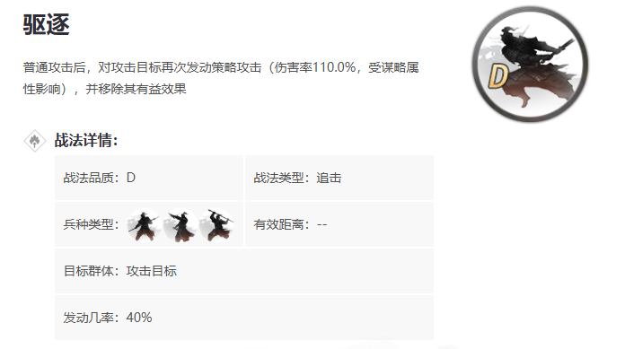 获得战法驱逐,咱们得先了解它的基础信息。驱逐是一个D品质的追击类战法,效果是在普通攻击后对目标再次发动策略攻击,同时移除其有益效果。这个战法适合搭配高攻速或连击型武将,比如骑兵或自带连战技能的武将,能有效克制依赖增益buff的敌人。战法研究
