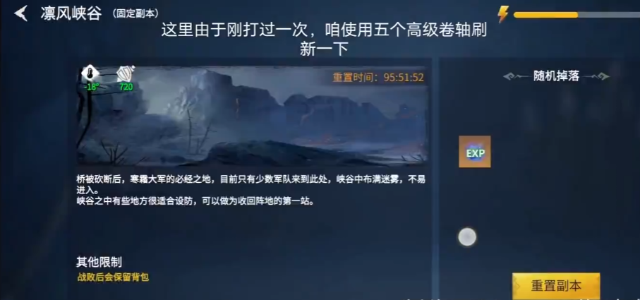 凛风峡谷作为冰原守卫者中重要的经验副本,其核心机制围绕拒马桩修复与怪物仇恨牵引展开。进入副本前需准备10个原木与5个麻绳用于修复拒马桩,同时建议携带双倍经验药水以提升收益。副本内怪物基础经验值较高,通过合理利用拒马桩的穿刺伤害可高效清怪,具