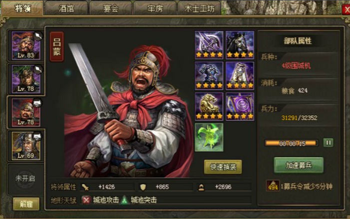 平民玩家的核心策略是合理分配有限资源,优先培养性价比高的武将。初期应选择30级左右的黄将或紫将作为过渡,如颜良、吕蒙等,避免过早消耗资源招募高阶武将。资源建筑需定时收取,并通过祭祀、集市等途径补充资源缺口。武将培养方面,优先升级主力武将的装