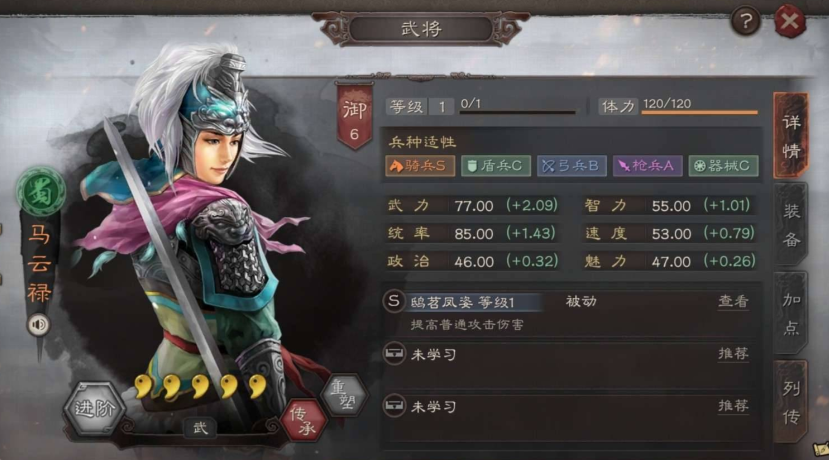 马云禄的武将定位围绕高普攻伤害展开,她的属性成长以武力为主,建议玩家在加点时优先选择全武力方向,以最大化她的输出能力。她的自带战法鸱苕凤姿能战斗回合推进显著提升普通攻击的伤害,尤其是在敌方兵力损失较多时,加成效果更加明显,这让她在持久战中表