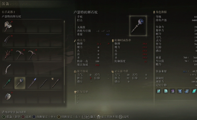 智力属性建议优先提升至60点以获得最佳收益,80点后成长曲线趋于平缓。生命力作为基础属性需保证至少20点以提升容错率,40点可达到1450血量阈值。集中力影响蓝条上限和法术释放频率,需根据常用法术消耗合理分配。法师装备选择以提升法术伤害为主,陨石杖是前期性价比最高的武器,后期可过渡至卢瑟特的辉石杖或亚兹勒的辉石杖。护符搭配建议选择魔法师球护符、魔力对蝎等增强法术威力的配件。