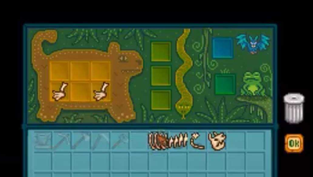 青蛙木乃伊可以在岛屿东部的杂草丛中找到,割草时记得多留意。蝙蝠木乃伊则要从火山石头里挖,虽然概率不高但石头数量多。蛇化石分为头骨和脊椎骨,头骨可以通过挖蚯蚓或者钓鱼获得,脊椎骨则要在农场地图的沙地区域挖蚯蚓。松鼠化石的腿骨和尾巴在挖掘场比较容易找到,挖骨头矿和淘金都有机会获得。