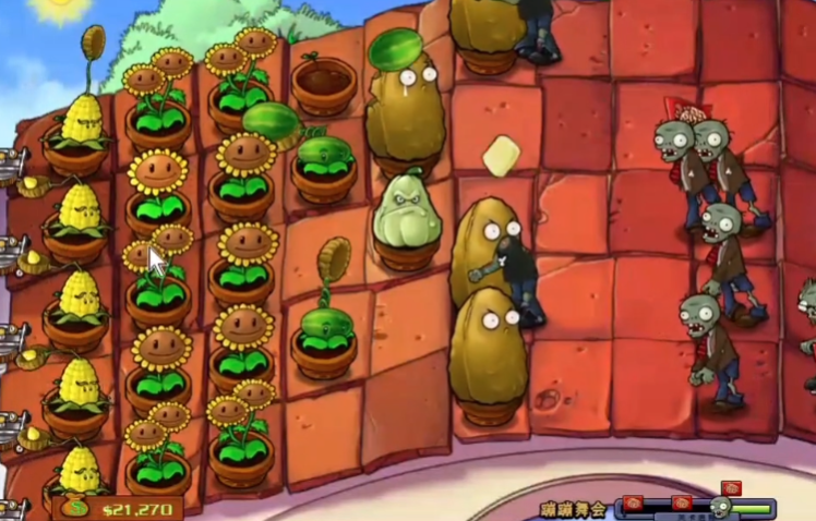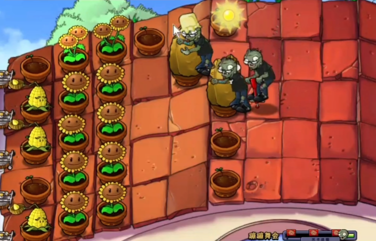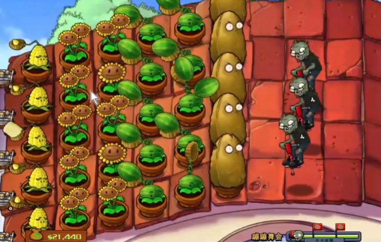 后期防线稳定后,可以多种双子向日葵提升阳光产量,同时补足攻击植物。高坚果要放在前排,后面摆满射手和投手。如果觉得压力大,可以加个南瓜保护罩保护植物。最后两排西瓜成型后,基本就稳了,轻松看僵尸们跳舞失败吧!