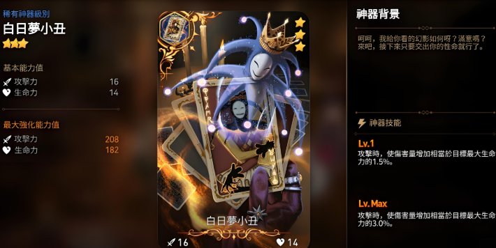 幻影的泰妮布里雅(暗法)作为PVE核心输出角色,其神器选择直接影响战斗效率。PVE环境下推荐优先使用嘉拉特拉白日梦小丑,该神器能根据目标最大生命值造成百分比伤害,面对高血量BOSS时效果显著。白日梦小丑的3%最大生命值附加伤害在深渊、讨伐等长线战斗中能稳定提升输出总量,尤其适合暗法这类依赖技能爆发的角色。