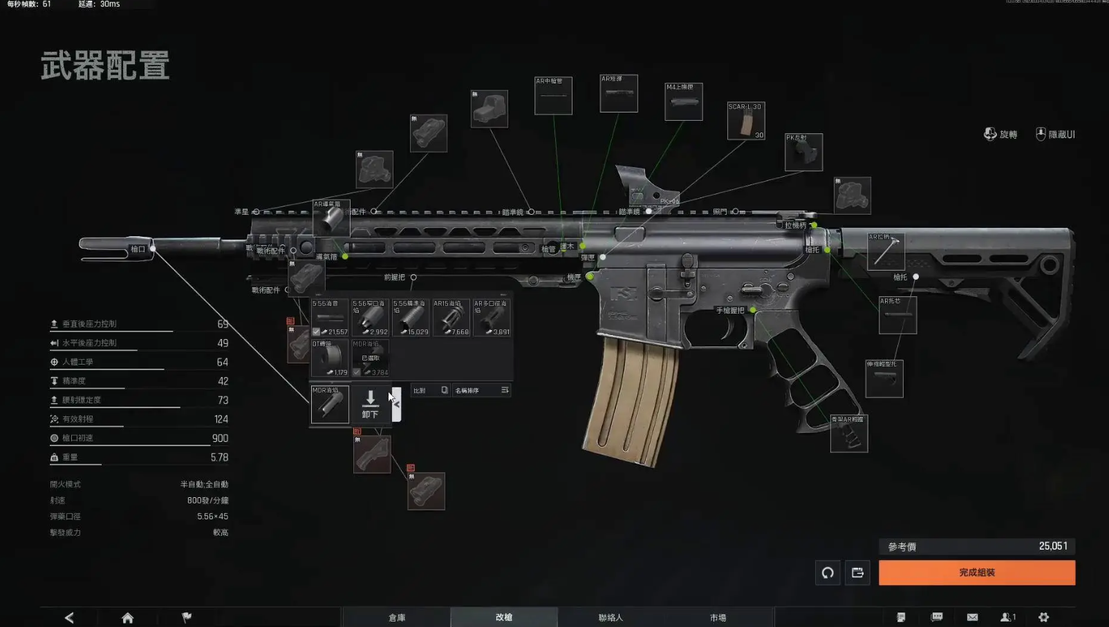 预算有限时可在枪托、握把和瞄具上适当减配,但需确保关键属性不低于阈值。护木可替换为AR特制护并加装斜向前握把或轻便前握把,后握把则选择工业AR后握或稳定AR后握。枪口若无法负担消音器,可暂用补偿器替代。弹匣建议至少配备60发容量以保证持续作战能力,避免频繁换弹影响战斗节奏。改装后的M4A1水平及垂直后坐控制应接近90,腰射稳定度也需维持在较高水平。