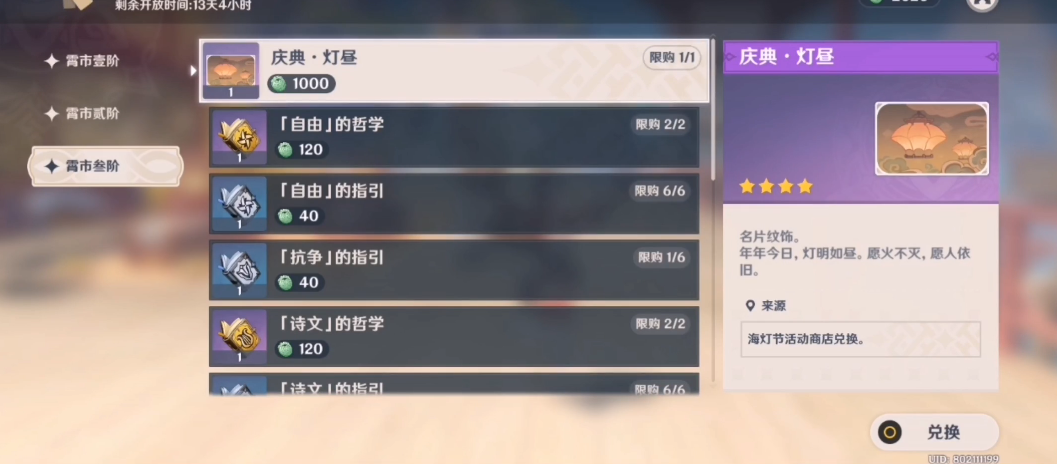 获取庆典灯昼需要完成海灯节系列活动任务。首先需解锁前置剧情任务灯自何处来,随后通过完成机关棋谭挑战积累平安玉符。当节庆热度达到万家霄灯光阶段后,前往霄市界面消耗指定数量的平安玉符即可兑换。该兑换选项仅在霄市第三阶段开放,错过活动期限将无法再次获取。