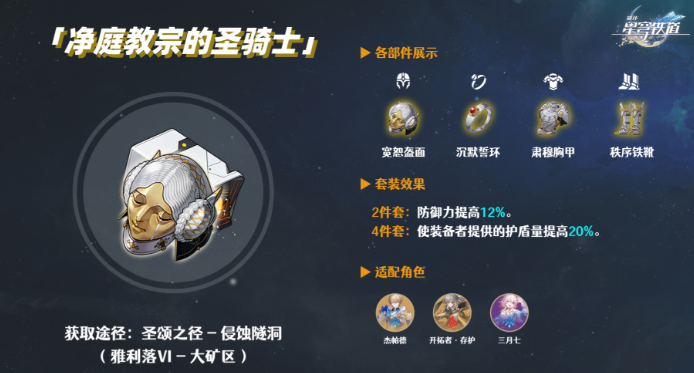 遗器方面推荐净庭教宗的圣骑士四件套搭配筑城者的贝洛伯格两件套,防御力和护盾量拉满。主词条选防御躯干、速度鞋、能量恢复绳,副词条优先堆效果抵抗和防御。如果暂时凑不齐,用2+2+2散件过渡也行,但毕业套的护盾提升非常明显。
