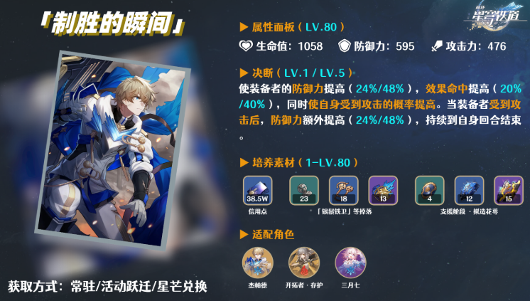 在光锥选择上,专武制胜的瞬间是最优解,大幅提升防御力和效果命中,让护盾更厚、冻结更稳。如果没有专武,四星的余生的第一天或朗道的选择也不错,前者增强全队抗性,后者提高受击概率帮队友分担伤害。三星过渡可以用琥珀,精炼满后防御加成很可观,前期完全够用。