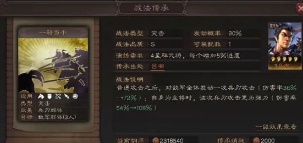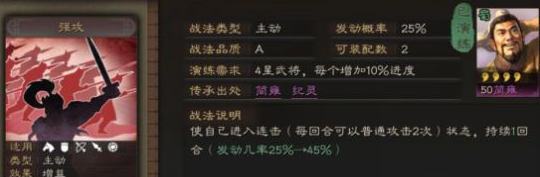 强攻是一种重要的A级战法,其核心作用是为武将提供连击状态,使武将在同一回合内进行两次普通攻击。该战法适合依赖普攻输出的武将,尤其是那些自带突击战法或需要频繁触发攻击特效的角色。强攻的获取方式相对简单,主要通过传承四星武将纪灵或简雍获得,演练时需要消耗若干三四星武将。