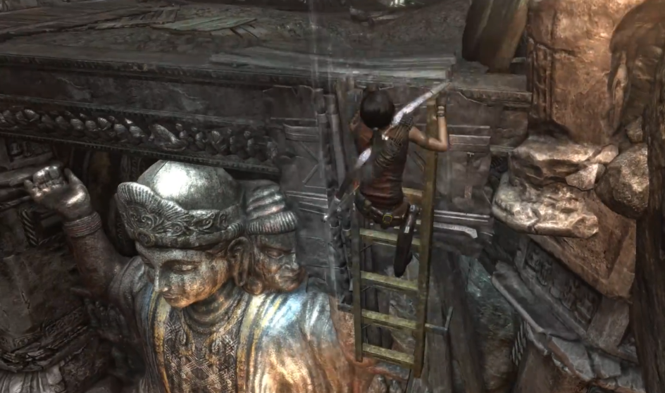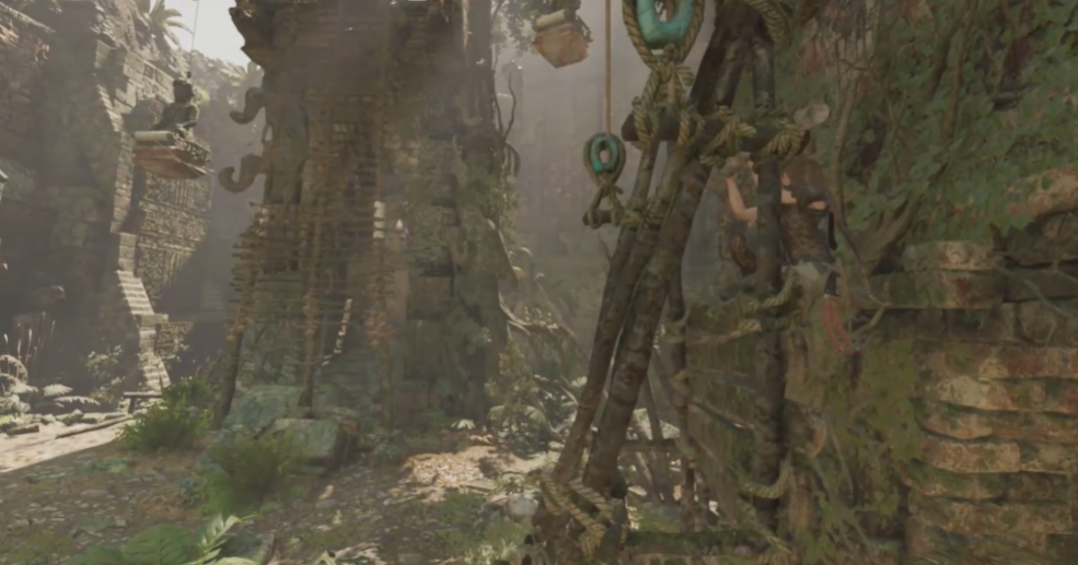 如果中途卡关,记得多用求生本能高亮可互动物件。谜题难度主要在于理解物理机关的三层联动:上层重物通过绳索控制小雕像升降,而小雕像又通过推车位置决定梯子倾斜角度。建议优先解决左侧机关,再处理右侧部分。古墓内没有战斗环节,可以放心探索,但部分攀爬点需要精准跳跃,尤其是从上层平台跳向重物时要注意落脚点。