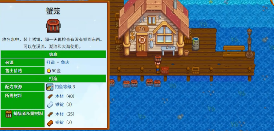 你可以自己制作,材料包括25个木材和2块铜锭,或者在鱼店直接花1500金币购买。制作蟹笼需要钓鱼等级达到3级,所以前期多钓鱼是必要的。拿到蟹笼后,找个靠近水的地方,比如海滩、河流或农场池塘,点击水面出现绿色格子时就能放置。记得提前准备鱼饵,点击物品栏中的鱼饵再点击蟹笼就能放入,这样第二天就能收获海鲜了。