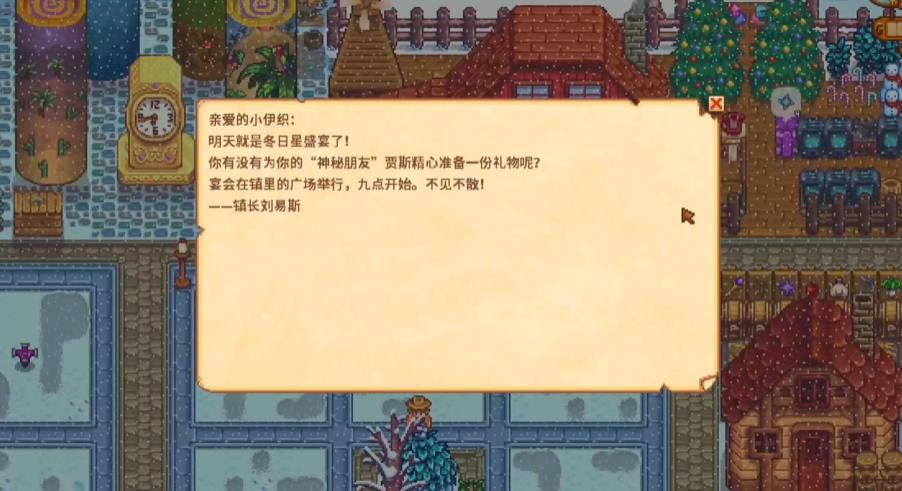 冬日星盛宴是星露谷物语中冬季最重要的节日活动,玩家需要提前一周做好准备。在冬季第18天,镇长刘易斯会通过信件告知玩家需要准备礼物的神秘好友身份,这个对象由系统随机分配。收到信件后,玩家应当根据该NPC的喜好提前准备合适的礼物,因为赠送对方最爱的物品能直接获得600点好感度,是游戏中提升人际关系效率最高的方式之一。