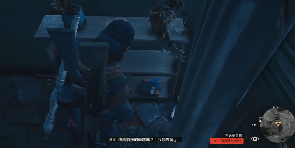 穿过书柜缝隙进入房间后,会发现莉莎已不在原处。需检查柜子上的笔记,内容包含手绘涂鸦,暗示她主动离开的意图。涂鸦笔触潦草但信息明确,是任务结束的关键道具。该场景设计强化了末日背景下人际关系的脆弱性,与主线剧情形成呼应。