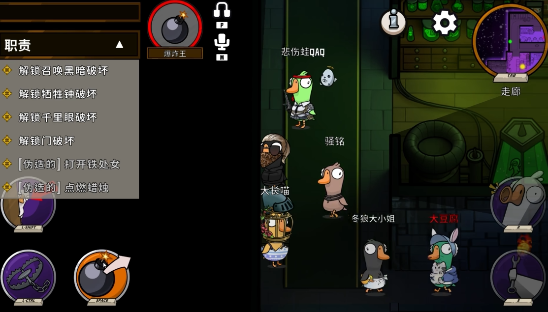 鸭子是坏人阵营的核心角色,它们的目标是通过各种手段消灭好人阵营的鹅,或者阻止鹅完成任务。鸭子的玩法非常丰富,不同的鸭子角色拥有独特的技能,比如隐身、静音、爆炸等,合理利用这些技能可以让你在游戏中占据优势。鸭子的行动需要隐蔽且高效,因为一旦暴露身份,很容易被好人投票淘汰。