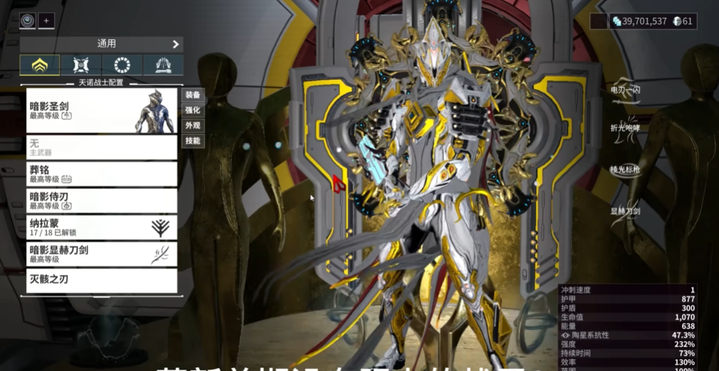 暗影圣剑是许多老玩家的心头好,黑色基调搭配暗红色能量纹路,神秘感拉满。它的外观设计参考了经典武士风格,但加入了星际战甲特有的机械元素,挥动武器时残影效果特别带感。这款战甲不仅颜值能打,实战表现也相当出色,尤其是近战连招的流畅度,配合外观特效简直行云流水。