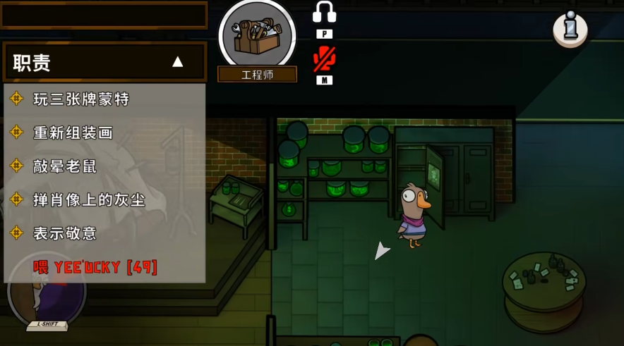 鸭子阵营中,部分无特殊技能的普通鸭子也能钻管道,但存在限制。静音鸭、变形鸭和派对鸭因拥有Shift键特殊能力而无法钻管道,但其他鸭子角色在未使用技能时可短暂进入管道。鸭子钻管道的冷却时间与鸽子相近,约10秒,通常用于快速接近目标或躲避追查。