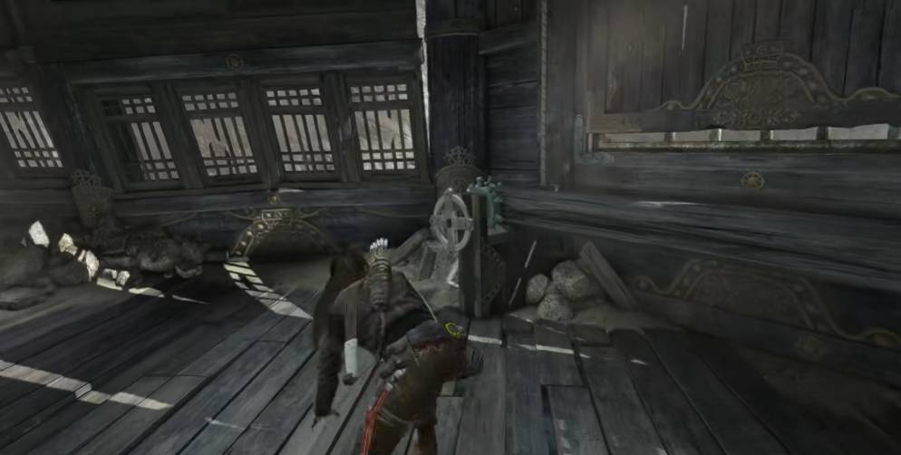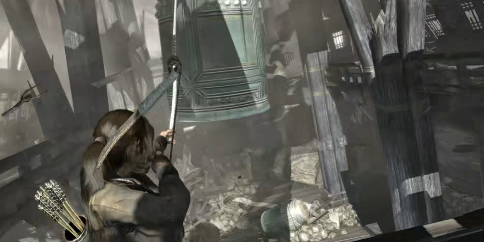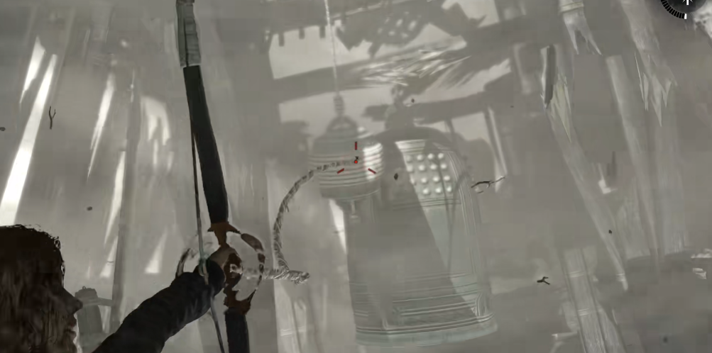 具体操作时,需注意风力对摆锤运动轨迹的影响。首次打开左侧风窗后,用弓箭瞄准摆锤并拉动绳索,借助风力使其撞击右侧支柱。完成后关闭左侧风窗,开启右侧风窗,以相同方式破坏左侧支柱。若撞击力度不足,可调整摆锤位置使其更靠近风口。两侧支柱均被破坏后,同时打开两扇风窗,摆锤会因风力叠加而大幅摆动,瞄准大钟顶部的横梁撞击即可。