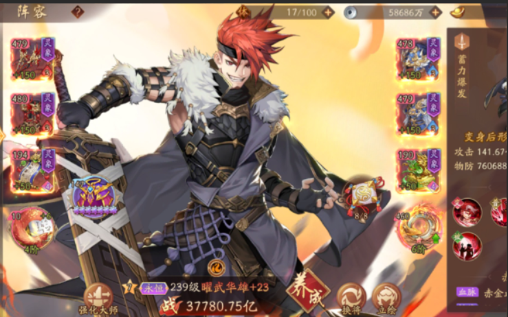 华雄作为重骑兵武将,在游戏中定位为残暴流核心输出,其技能斩将夺旗能对残血目标造成斩杀效果,配合以战养战的吸血机制,兼具爆发与续航能力。围绕华雄构建阵容时需优先激活残暴流羁绊(需3名残暴武将),同时搭配破甲、控制类武将弥补其惧怕高防御阵容的短板。核心思路是通过重骑兵的高额破阵伤害快速撕开敌方前排,为华雄创造收割环境。