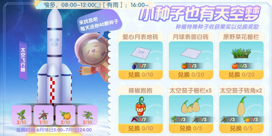 火箭是一种特殊装饰或功能性道具,获取方式主要与特定活动相关。目前已知的火箭获取途径包括参与种子的天空梦活动,通过种植太空变异植物兑换太空飞行器(火箭造型家具)。该活动需要玩家种植特殊太空种子,收获变异作物后与NPC土伯伯兑换奖励。需此类活动通常有期限,若已结束则需等待官方复刻或类似活动重新开放。