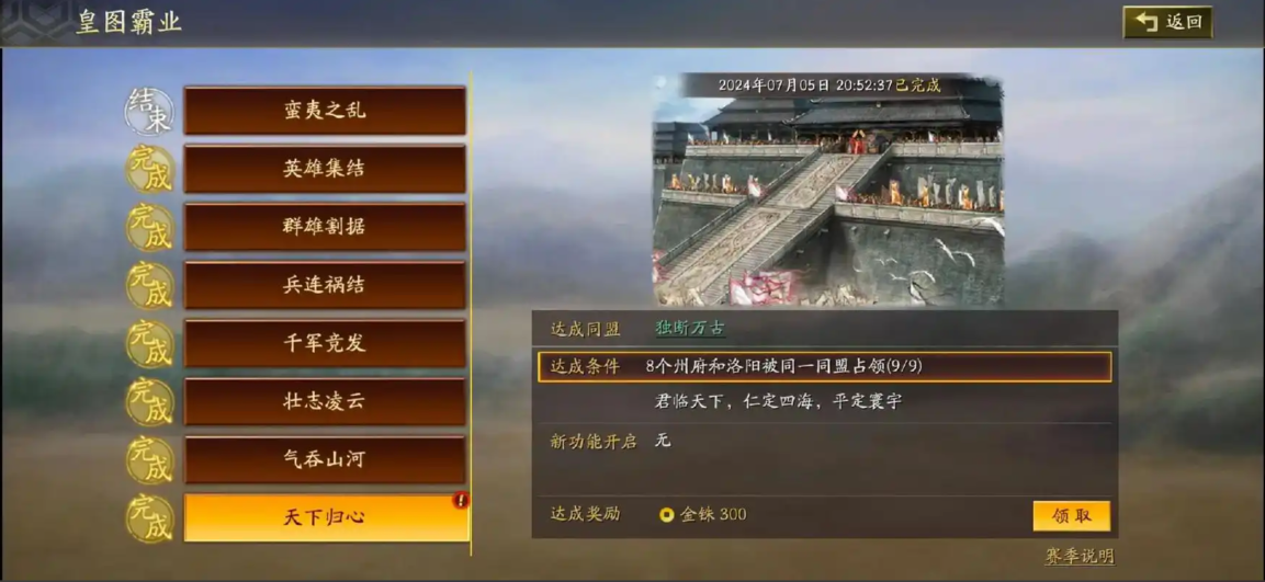 完成霸业是玩家共同追求的最高目标,其核心在于全服协作完成阶段性任务并最终占领洛阳。霸业进程分为多个阶段,每个阶段解锁特定功能与奖励,初期阶段如英雄露颖要求全服占领5000块四级地,完成后开放战斗经验值获取和200金铢奖励。中期广聚英杰需要10个同盟人数超60人,解锁贼寇玩法提供额外资源获取途径。后期阶段如虎踞鲸吞则需同盟在限定时间内攻占指定数量城池,奖励转为包含稀有武将的霸业卡包。