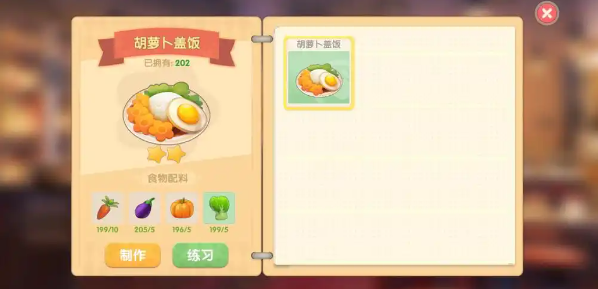 胡萝卜盖饭需要通过烹饪系统制作,材料包括胡萝卜和鸡蛋。胡萝卜可以在家园种植,鸡蛋则来自饲养的鸡。收集齐材料后,去餐厅的厨房界面选择胡萝卜盖饭食谱,点击制作即可。如果背包里已经有现成的盖饭,直接跳过这一步。