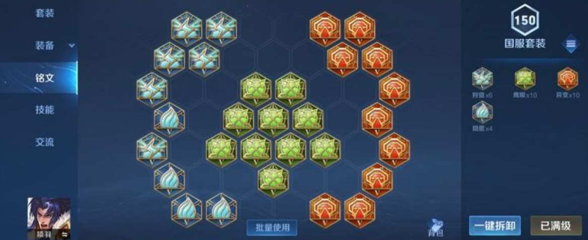 偏向输出和半肉的对抗路项羽常用铭文会注重物理攻击和穿透,例如搭配隐匿、鹰眼和异变的百穿铭文,或者插入一些传承和祸源来提升攻击力与暴击几率。而纯肉坦克玩法的项羽,铭文则更侧重于生命值和防御,通常会选择宿命、虚空和调和这套经典的坦克铭文,它们能提供大量的生命值、物理防御、冷却缩减以及每5秒回血,让项羽在前中期就非常能扛。