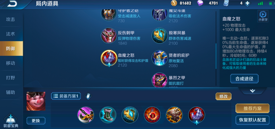 出装的顺序出门自然是买打野刀,之后优先合成抵抗之靴或者影忍之足,这要看对面控制多还是物理伤害高。第一件大装备很多人喜欢先出红莲斗篷,因为它便宜,有血量有护甲,被动灼烧效果还能提升猪八戒的清野速度和贴身战斗时的伤害。之后的核心装备是不死鸟之眼,这件装备能极大地增强猪八戒被动的回复效果,让他越打越能回血。