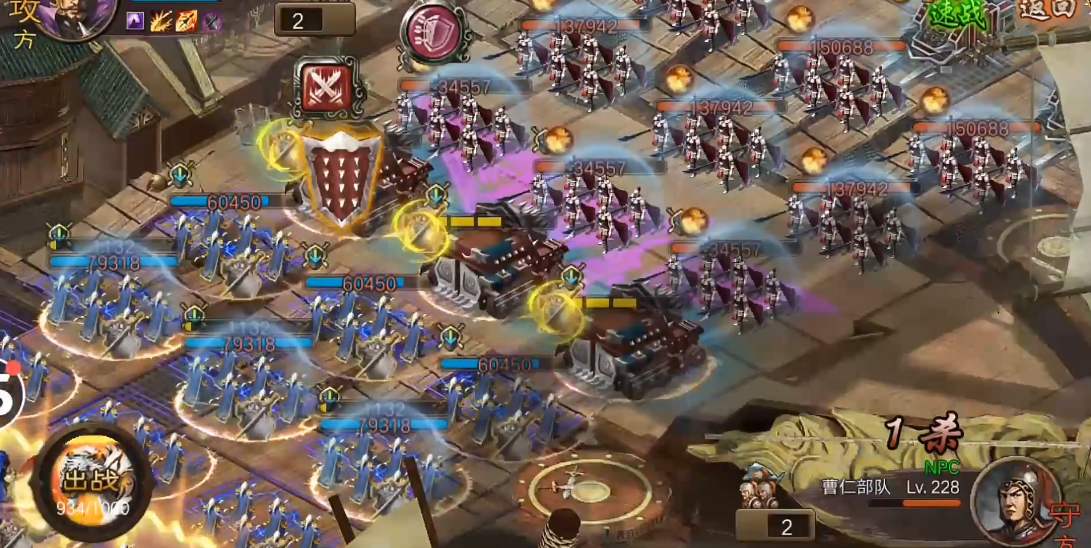 比如孙权、夏侯惇和夏侯渊这些武将最好不要带宝物,这样在普通攻击时可以减少格挡的发生,提高伤害效率。低配打法中,孙权可以携带紫爪和车,避免使用双紫甲或单紫甲,因为副本要求击败1.5个部将,如果装备不当可能无法满足通关条件。副本地形和武将特性也要求玩家合理计算战车破甲次数,确保每排武将能完成特定击杀指标。如果有觉醒的马超,会大大降低难度,因为它能封禁敌方武将的战法,创造更多输出机会。貂蝉起手战法后,能混乱住敌方第五将的前四排,而孙权在吃下第三将战法后,利用攻击减弱效果快速清理前两排敌方兵力,副将则负责打残第三排,从而完成阶段性任务。曹操在放战法时需要确保不被格挡,夏侯渊作为副将则可以辅助输出,击杀一排敌方武将。