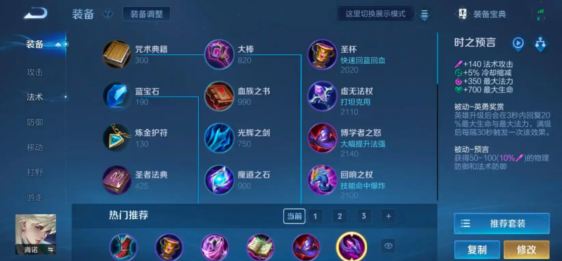 出装顺序是冷静之靴、回响之杖、噬神之书、痛苦面具、日暮之流,最后补上博学者之怒。这套装备冷却缩减够,续航也足,回响和面具能让你远程一技能消耗起来特别疼,日暮之流叠起来后打坦克也不虚。如果你想走对抗路或者阵容需要你稍微能抗一点,那可以出冷静之靴、噬神之书、闪电匕首、时之预言、日暮之流和巫术法杖,闪电匕首加攻速和移速,时之预言提供血量和双抗。