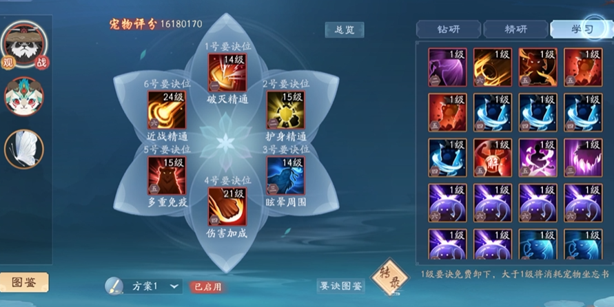 真正让它变强还得靠后续的培养。首先是宠物驯养,这个在43级开启,主要是提升宠物的五个兴趣点:健身加气血和防御,清洁加破防和格挡,玩耍加命中和闪避,卖艺加暴击和抗暴,学习加攻击力。把这些兴趣点用低阶玉露丸培养满之后,还能用草还丹进行突破,突破后属性转换比例会提高,意味着宠物能给你人物加成的属性更多了。然后是宠物要诀,也就是给宠物学技能,这能在74级开启。宠物有自带的专属要诀,也可以通过后天学习通用要诀来增加技能,总共6个要诀位,不同位置能学的要诀类型也不同。通过学习要诀和后续的钻研升级,可以显著提升宠物在战斗中的表现,甚至有些要诀还能直接增强你人物的属性。