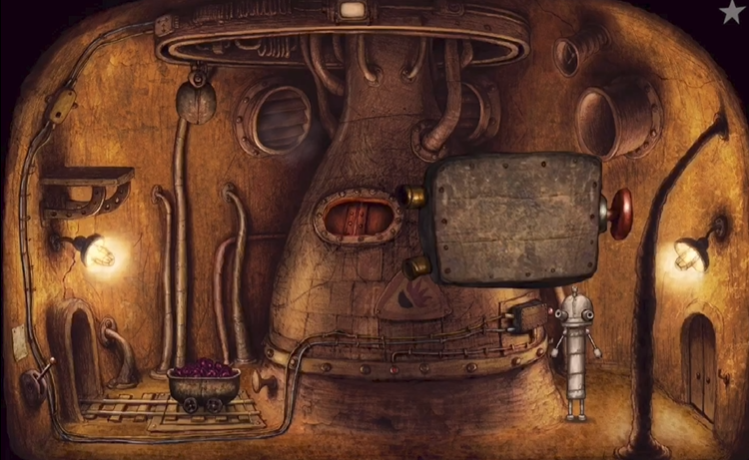 你从洞口出来后会看到一个胖子机器人正在偷吃煤炭,吃完一整车后它就从窗口溜走了。这时候别慌张,先走到画面右下方那个锁着的门旁边,墙上挂着一把钥匙,把它拿起来收好。钥匙是后面解开谜题的关键道具之一。接下来需要处理锅炉区域的机关,走到画面中间的锅炉那里,点击那个不停闪烁的小红灯,这样右边的开关面板就会打开。
