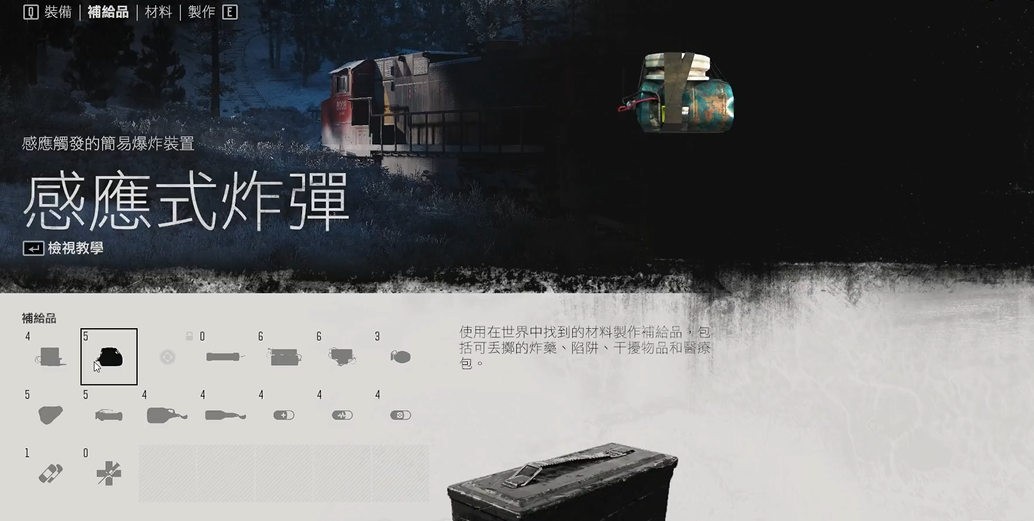 材料收集是制作系统的基础环节,资源类型分为基础耗材和特殊材料两大类。基础耗材包括废铁、碎布、煤油和酒精等,常见于人类营地、废弃房屋和车辆中;特殊材料如羽毛、金属碎片和特定植物则需在野外或特定区域寻找。材料携带量存在限制,例如废铁最多可携带10个,酒精类物品通常为3个,多余材料可存放于营地储物箱中,避免影响紧急情况下的制作效率。