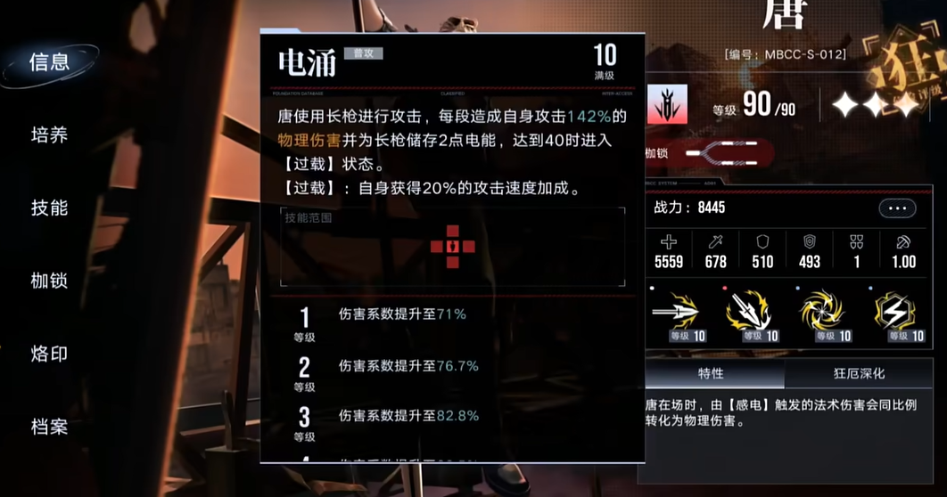 唐是一位以物理伤害和感电效果为核心的狂暴特化型禁闭者。他的技能体系围绕着电能积累与消耗以及感电标记的施加与利用展开,理解其技能联动的核心循环是决定技能升级优先级的关键。他的普攻电涌不仅是主要的伤害输出手段,更是启动整个技能循环的引擎,每次攻击都能积攒电能,为后续的强大状态与技能释放奠定基础。