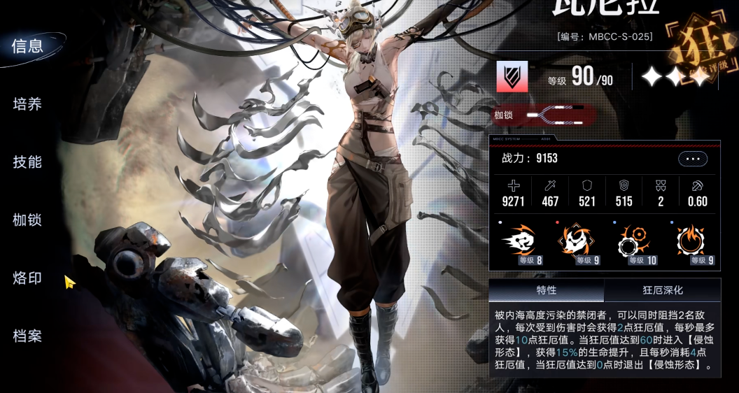 瓦尼菈的专属烙印进一步拓展了她的战术功能。开启后不仅能增加阻挡数,还会新增一个专属必杀技能穿越永恒。该技能允许她跳跃至指定位置,对落点周围造成范围伤害并立刻获得狂厄值,这提供了宝贵的位移、快速启动侵蚀状态以及应急群伤能力,每场战斗可使用两次。在烙印搭配上,可以考虑选择那些能在非攻击状态下提升属性的套装,以契合其蓄力回血的战斗节奏。她的高生命值模板和伤害机制,使得她与能够复制伤害的角色如麦昆配合时,能产生显著的协同效应。