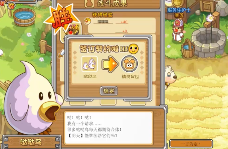 个小家伙通常出现在阳光牧场和开心农场这两个地方,你在这两个区域溜达的时候,眼睛放亮点就能发现它了。除了哒哒鸟,这里也是火之鬼脸箱、小宅罐这些精灵经常出没的地方,所以一片区域可能有好几种小精灵呢。找到它是第一步,也是最关键的一步,因为它不会满世界乱跑,就固定在这两个牧场和农场区域刷新。你到了地方以后,直接在场景里找到它,点击它就能进入对战准备抓它了。