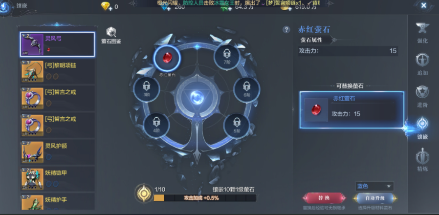 萤石就是镶嵌在装备上给你加各种属性的石头,不同颜色的萤石效果差别很大,你可千万别小看了它们。对于弓箭手这种远程职业,首要任务肯定是把伤害打足,所以提升攻击力的红色萤石基本上是必选的,它能直接拉高你的攻击面板。 光有攻击还不够,暴击对弓箭手来说也特别重要,一箭暴击那感觉可太爽了,所以能增加暴击率的黄色萤石也是核心选择之一。 另外别忘了紫色萤石,它通常能强化你的技能伤害或者减少技能冷却时间,让你放技能更频繁,这对依赖技能输出的弓箭手来说简直是如虎添翼。