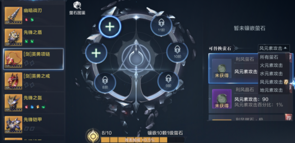 光顾着打人自己皮薄也不行,所以生存能力的搭配也得考虑进去。特别是在前期或者打一些高难度副本的时候,你可能发现自己有点脆,这时候蓝色和绿色萤石就能帮上大忙了。蓝色萤石主要增加生命值,让你血条更厚实,不容易被秒。 绿色萤石则能提升防御力,减少你受到的物理伤害。 你可以根据自己当前的感觉来调整,比如感觉老是被怪物摸到,那就多镶嵌点蓝色和绿色萤石,等装备和等级上来了,生存压力小了,再慢慢换成更极端的输出搭配。没有一套固定不变的方案,关键是看你现在需要什么。