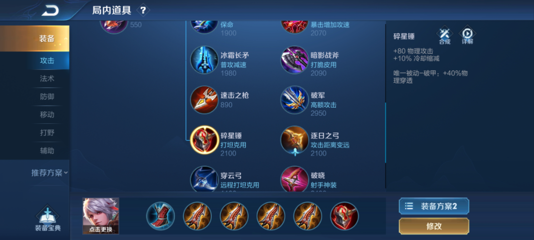 出装路线上,前期通常以急速战靴和暗影战斧(或陨星)作为起步,这能保证清线能力和技能冷却。中期核心装备会围绕破军和碎星锤(或破晓)构建,前者大幅提升攻击力并对残血目标有额外伤害,后者提供高额的百分比物理穿透,用以针对敌方的防御装备。百里守约的一技能被动可以在静止时叠加物理穿透层数,这与装备提供的穿透效果相结合,能让二技能的狙击伤害达到峰值。