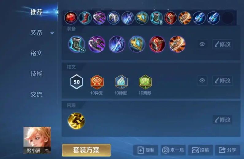铭文搭配需强化穿透与续航,通用且强力的选择是10异变、10鹰眼、10隐匿的百穿组合,它能提供可观的物理攻击、物理穿透和移速加。这套铭文让姬小满的伤害提升非常直接,移速加成也方便支援和追击。如果对线期压力较大,追求更高的容错率和续航,可以将部分隐匿铭文替换为调和,以提升前期的生命值与回复抗压能力。