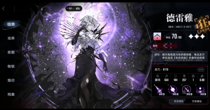 堇的技能组设计围绕持续作战与伤害增益展开。她的普通攻击伞刃是主要的能量回复手段,与依赖时间回能的角色不同,这要求她在站位上能够持续进行输出。被动技能狂樱会周期性对前方敌人发动多段快速刺击,并施加生命流逝标记,造成持续8秒的伤害,这为她提供了可观的额外伤害来源,增强了其持续输出能力。另一个被动花中潜影则是一个朴实的增伤技能,当前方一格存在友方单位时,堇获得10%的伤害提升,这要求玩家在布阵时有一定的位置考量,以最大化其输出。