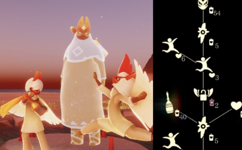 这位旅行先祖能够兑换的主要物品包括标志性的红狐狸面具,它需要54根白蜡烛。但想兑换面具必须先解锁其前置节点,这需要准备好2根升华蜡烛和3颗爱心来升级二级蹦跳动作。先祖带来的其他赠礼还有一个小铃铛乐器,总共需要107根白蜡烛、13颗爱心和2根升华蜡烛才能兑换所有物品,因此提前储备好足够的蜡烛和爱心很重要。