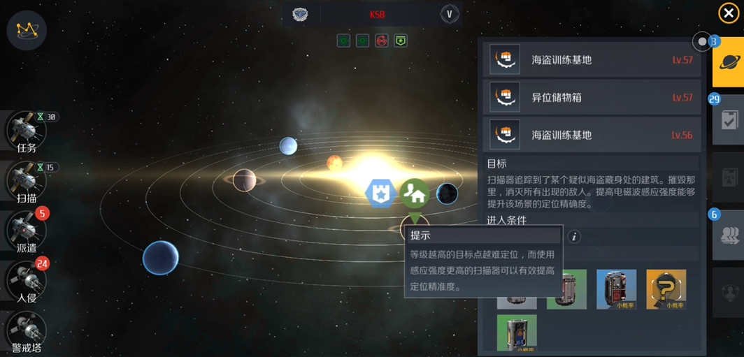 扫描到的信号源类型决定了后续行动。引力波扫描器发现的富矿小行星带,开采后可以得到原矿,在空间站加工成矿物资源。电磁波扫描器定位的海盗训练基地,消灭那里的海盗后能获得海盗储物箱,开出用于舰长升级的记忆移植体。放射波扫描器探测到的舰船残骸,则可以进行打捞,获得的废弃元件可以出售换取信用点。根据不同的目标,玩家需要提前调整好舰船的配置,例如进行战斗任务需强化火力和防御,执行开采任务则更适合使用工业舰船。