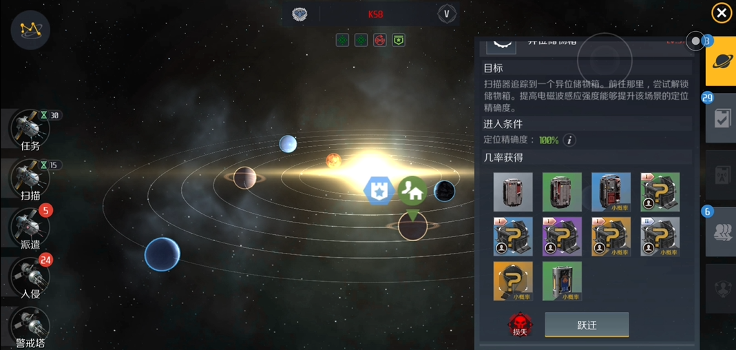 使用扫描器时,需在星系星图中使用任务探针进行扫描以刷新出可接取的星系任务。扫描时需要注意,信号源的等级越高,定位难度就越大,如果扫描设备的精确度不足,可能会导致跃迁出现偏差甚至使信号源消失。星系的人口活跃度也会影响扫描结果,在人口过于稠密的活跃区域,有可能扫描不到任何信号,因此建议选择活跃度较低的星域进行扫描以提高效率。