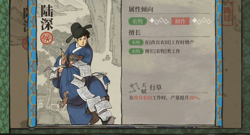 陆深是游戏中的一名侯阶居民,擅长制作和农牧,他的核心用法是安排在改良农田工作,以利用其天赋大幅提升农田产量,是开荒和农业发展的得力助手。陆深的初始属性中制作能力突出,为257点,农牧为83点,理财72点,建造100点,探险40点。当他满级后,制作和农牧属性会得到显著成长,分别达到604点和602点,这使他非常胜任与制作、农牧相关的工作。他的天赋名为行草,其效果是当他在改良农田工作时,能够提升20%到50%的产量,这项能力在游戏前期资源紧张时尤为重要。