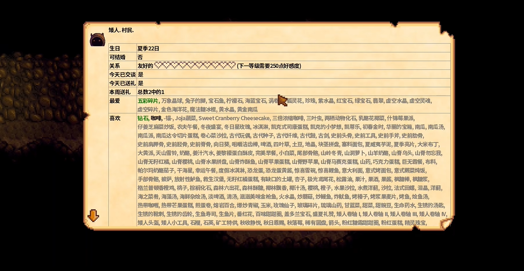 提升矮人好感度的核心方法在于定期且有针对性地赠送礼物,需每周最多只能向矮人赠送两次礼物,但生日当天的送礼不计入此限制且能获得额外的好感度加成。选择正确的礼物至关重要,矮人偏爱各类宝石矿物,如紫水晶、黄水晶、翡翠、绿宝石、海蓝宝石、红宝石、万象晶球、柠檬石等,同时也喜欢所有烹饪美食、工匠物品以及花朵。玩家应避免赠送矮人讨厌的物品,例如所有蛋类、奶制品、大多数植物以及黏土等,否则会导致好感度下降。通过坚持赠送其喜爱的礼物,好感度会以心为单位逐步增长。