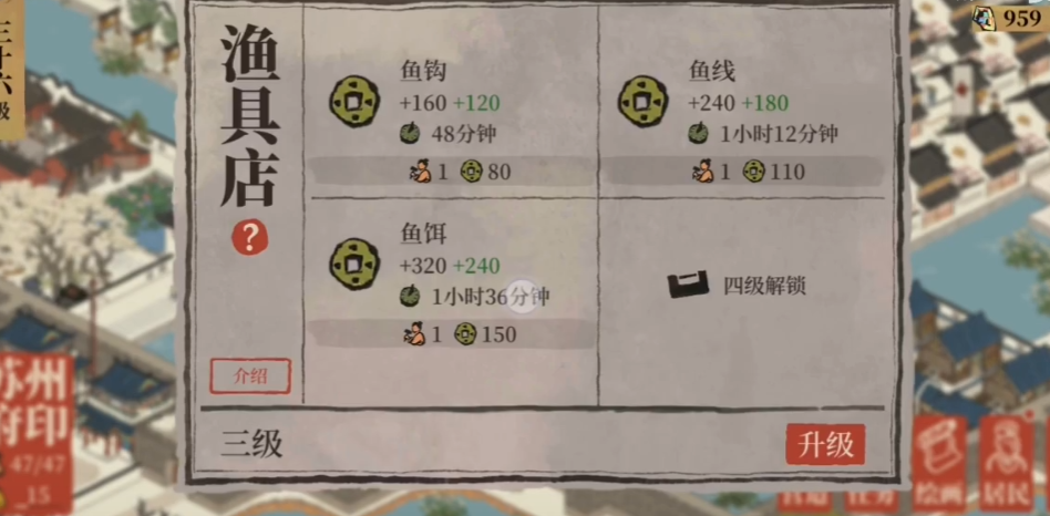 苏州府的渔具店在通贵狸雕像加持下表现突出,三级渔具店单次安排任务后可获得410铜币,最多可建造16个这样的建筑。这种设置适合佛系挂机玩法,玩家只需安排任务后下线,再次上线时即可收获大量铜币,是后期开图资金需求大的有效解决方案。