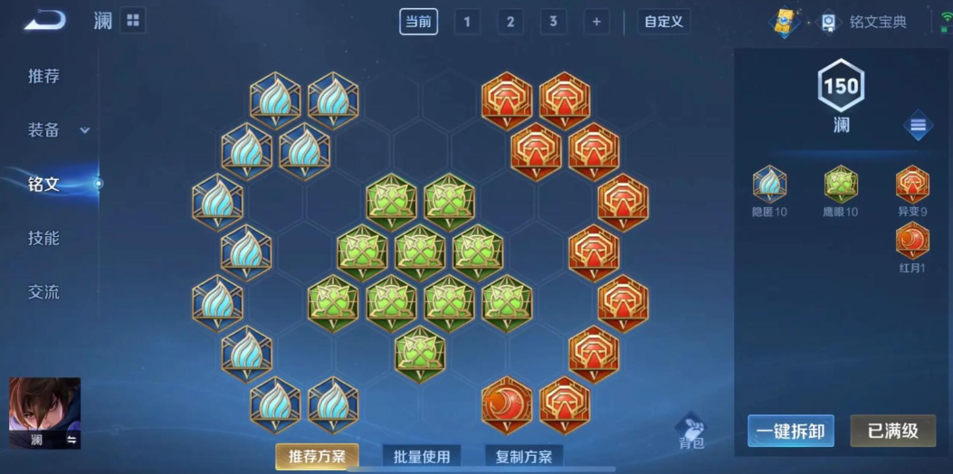 二技能命中的目标越多,可存储的强化普攻次数就越多,同时回复效果也越显著,因此在团战中应尽量在兵线或多名英雄附近使用,以实现伤害与续航的最大化。大招具有强制位移效果,可用于开团、回推关键目标或作为位移撤离,使用时需避免在敌方关键控制技能未交时盲目进场。对局的整体打法思路与节奏掌控决定了玩法的实战成效。澜定位为刺客型打野,前期应以稳健发育为主,利用技能特性快速清野,并抓住敌方线上英雄的走位失误进行gank,建立早期优势。