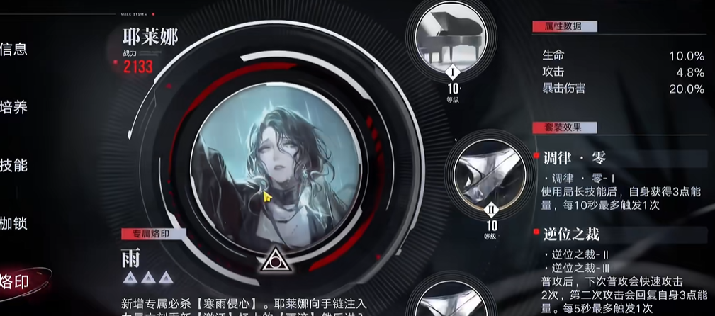 耶莱娜作为暴击辅助天花板,专属烙印清除雨滴效果并提供暴击增益,1枷锁以上搭配钟楼心之殇可实现50%爆伤加成,是黛伦等暴击主C的必备拐位,而白逸通过专属烙印将暴击率转化为攻击力,极限操作下可获得近200%攻击增幅。