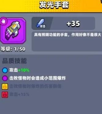 除了上述核心手套,其他种类的手套也各有其定位。发光手套在达到紫色品质后,击败怪物时会引发小范围爆炸,这种效果在怪物密集的中期阶段清怪效率很高,因此它是刷取金币和资源的玩家最喜欢的装备,但其伤害在面对高强度首领战时较为乏力。皮制手套因其属性机制与永恒手套相似,常被称为小永恒,它提供了暴击几率与流血效果,特别适合与苦无等武器搭配进行风筝战术,是新手玩家在没有更高阶手套时可靠的过渡选择。厚重手套的属性则相对较弱,其产生的辐射圈伤害效果一般,通常仅在玩家没有其他选择时临时使用,不过有娱乐性的厚重挂机流玩法可供尝试。