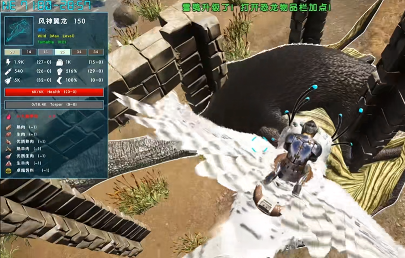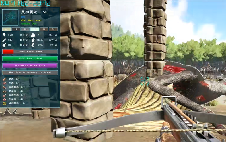 驯服风神翼龙需要充分的准备工作和特殊的空中击晕技巧。你需要提前驯服一只高耐力、高负重的飞行坐骑,例如阿根廷巨鹰或古神翼龙,作为你的辅助工具。关键的装备包括长管步枪搭配强效麻醉药或麻醉镖、十字弩、至少两个降落伞以及一个爪钩,同时务必准备好霸王龙蛋饲料以加速驯服过程,并携带木质拒马用于击晕后的保护。